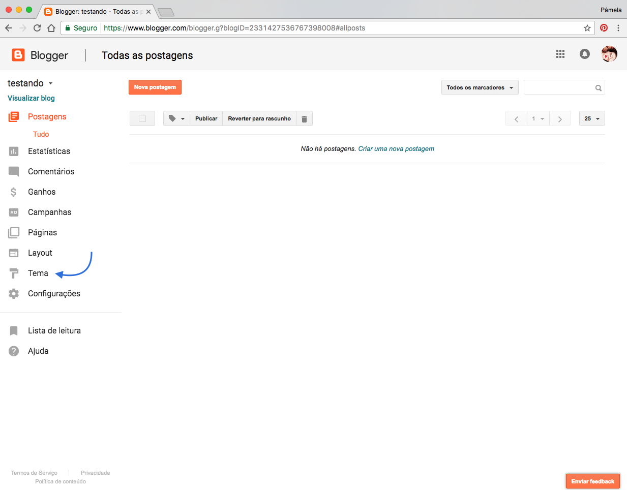 4. Clique em Tema (esta localizado no canto esquerdo da tela).